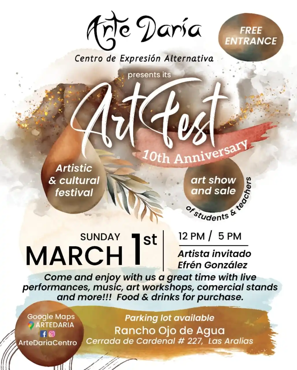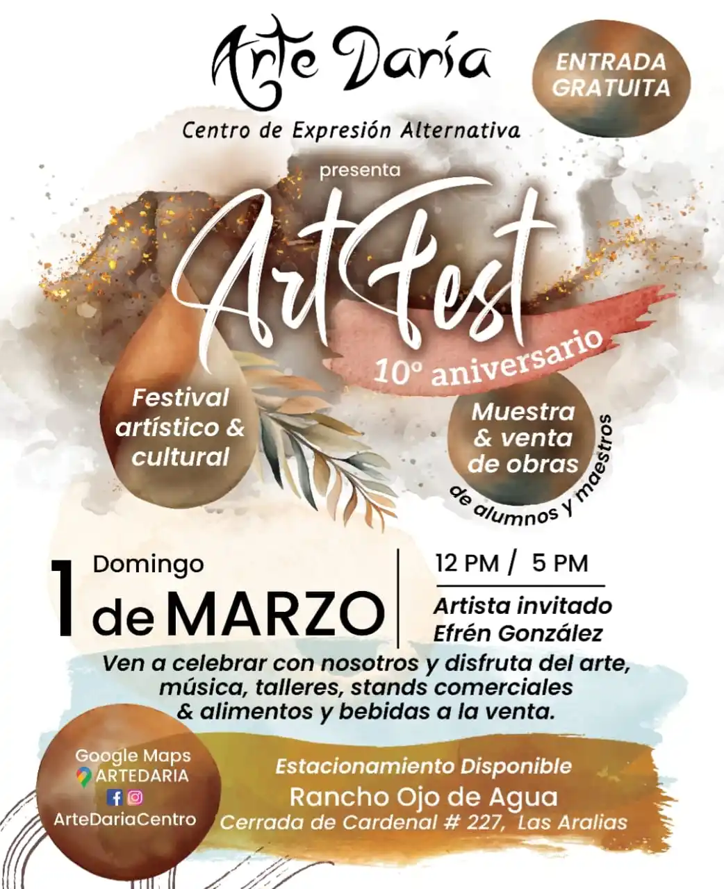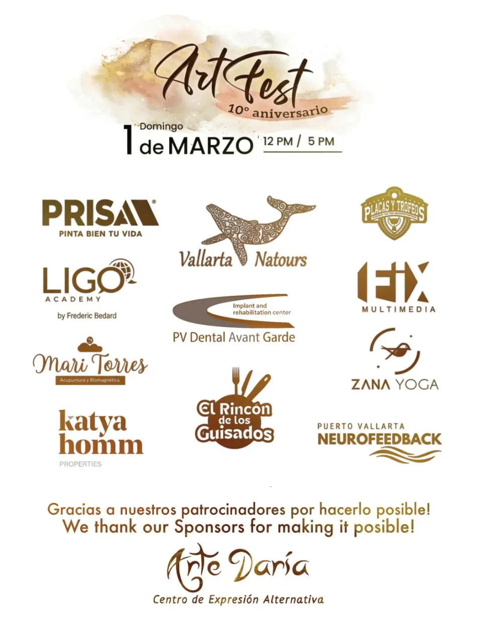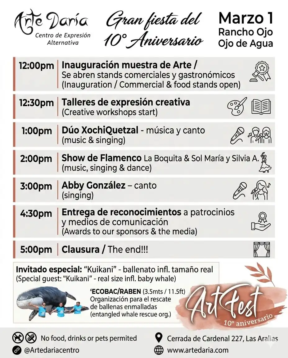 Arte Daría Centro de Expresión Alternativa celebra su 10º aniversario con ArtFest, una jornada artística y comunitaria en Rancho Ojo de Agua. El programa incluye inauguración de muestra de arte, apertura de stands comerciales y gastronómicos, talleres de expresión creativa (barro, pintura experimental y collage), música en vivo, show de flamenco y ceremonia de reconocimientos a patrocinadores y medios. También participa como invitado especial ‘Kuikani’, un ballenato inflable de tamaño real presentado por ECOBAC/RABEN para concientizar sobre el rescate de ballenas enmalladas. Patrocinan: PRISA — Pinta Bien Tu Vida, Vallarta Natours, Placas y Trofeos, LIGO Academy (by Frederic Bedard), IEX Multimedia, PV Dental Avant Garde, Mari Torres — Acupuntura y Biomagnética, Zana Yoga, Katya Homm Properties, El Rincón de los Guisados y Puerto Vallarta Neurofeedback. Entrada gratuita con estacionamiento disponible; talleres con contribución de recuperación.