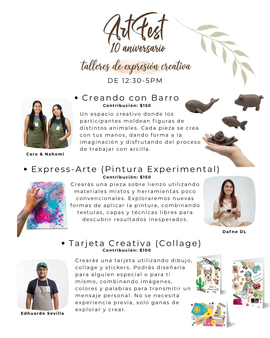 Habrá tres talleres: Creando con Barro ($150), Express-Arte: Pintura Experimental ($150) y Tarjeta Creativa: Collage ($100). Inician a las 12:30pm y se extienden hasta las 5:00pm.